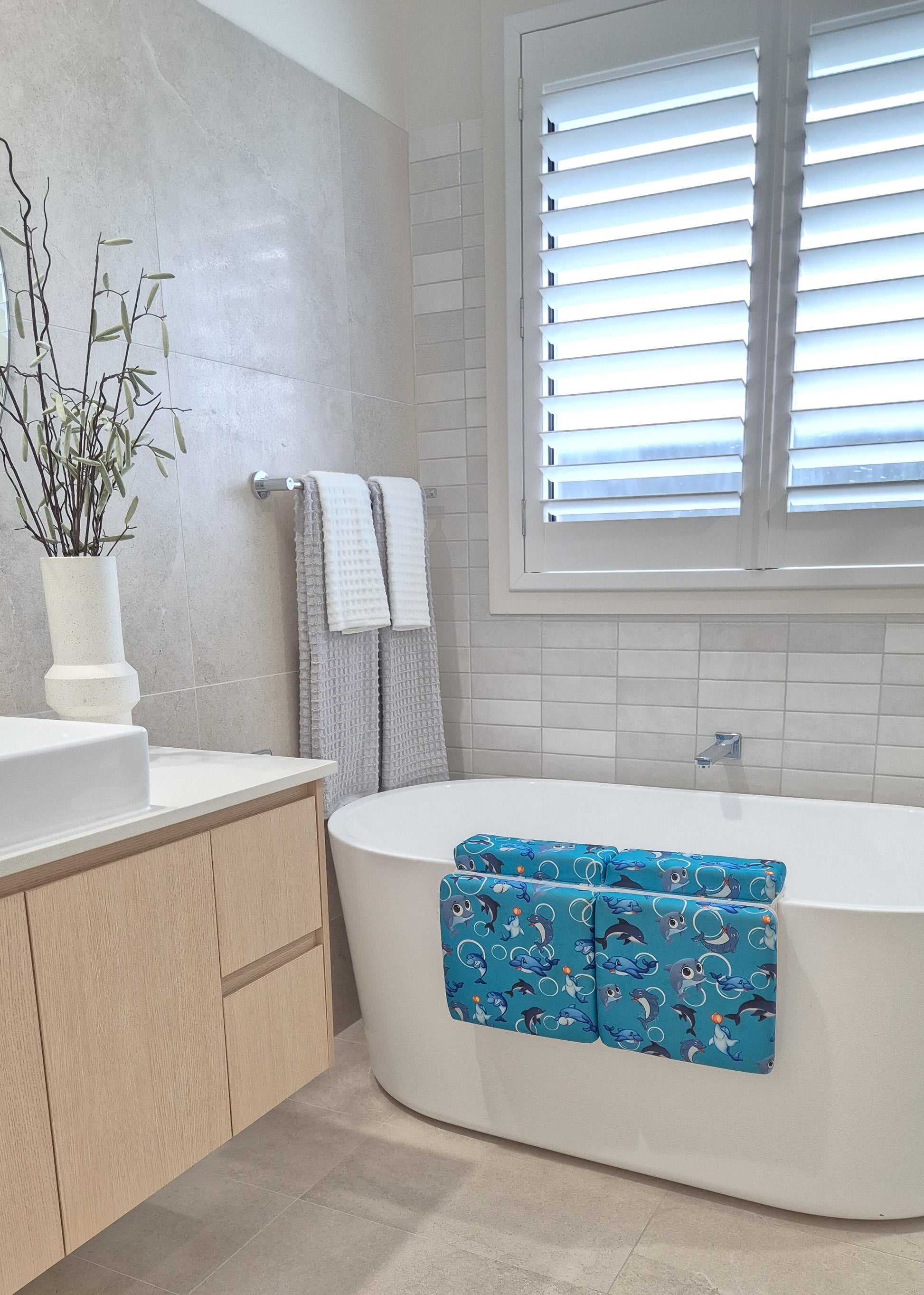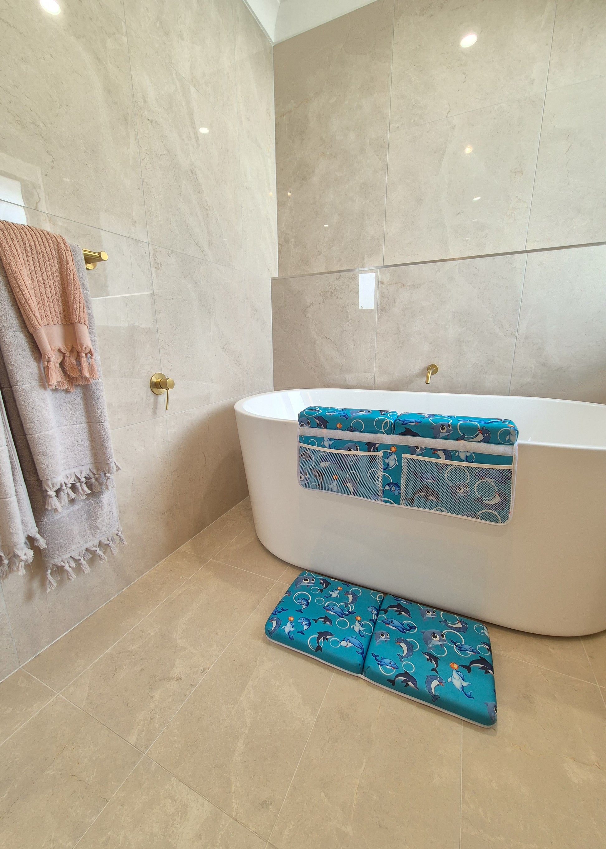 We have specially designed our baby bath kneeler and elbow rest pads to give you maximum comfort during these precious moments. The 4cm thick cushion will protect your knees and elbows from the hard bathroom floor and bathtub edge so you too can relax and enjoy watching your little one in the bath.