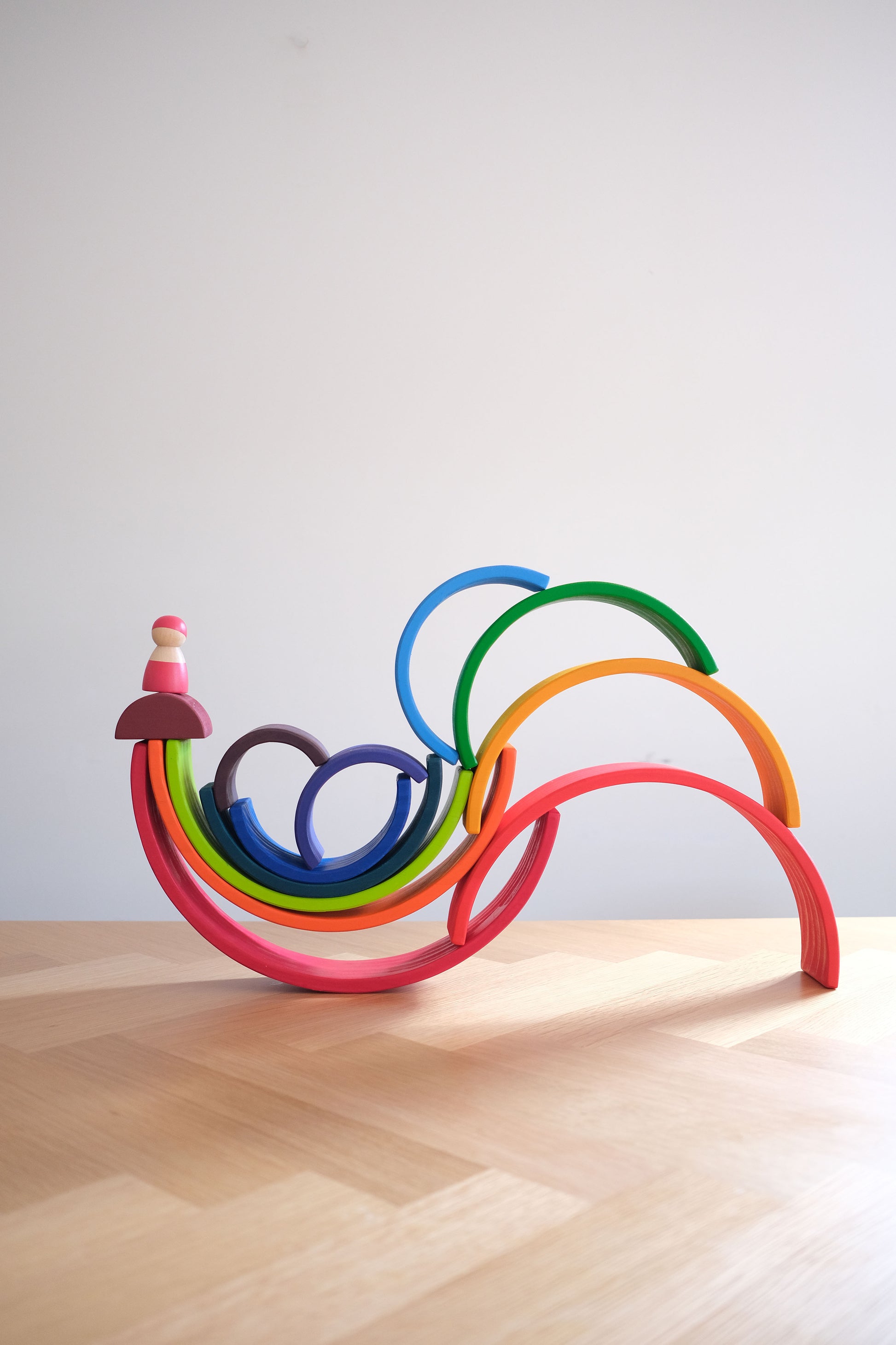 Did you know that not all rainbows are created equal? and that is to do with its stackability. Our rainbows have been specially made to ensure maximum stackability by performing a sanding technique that gives the arches a slightly textured surface and use non glossy water based paint. If you want a shiny and glossy finish, this is not the toy for you.