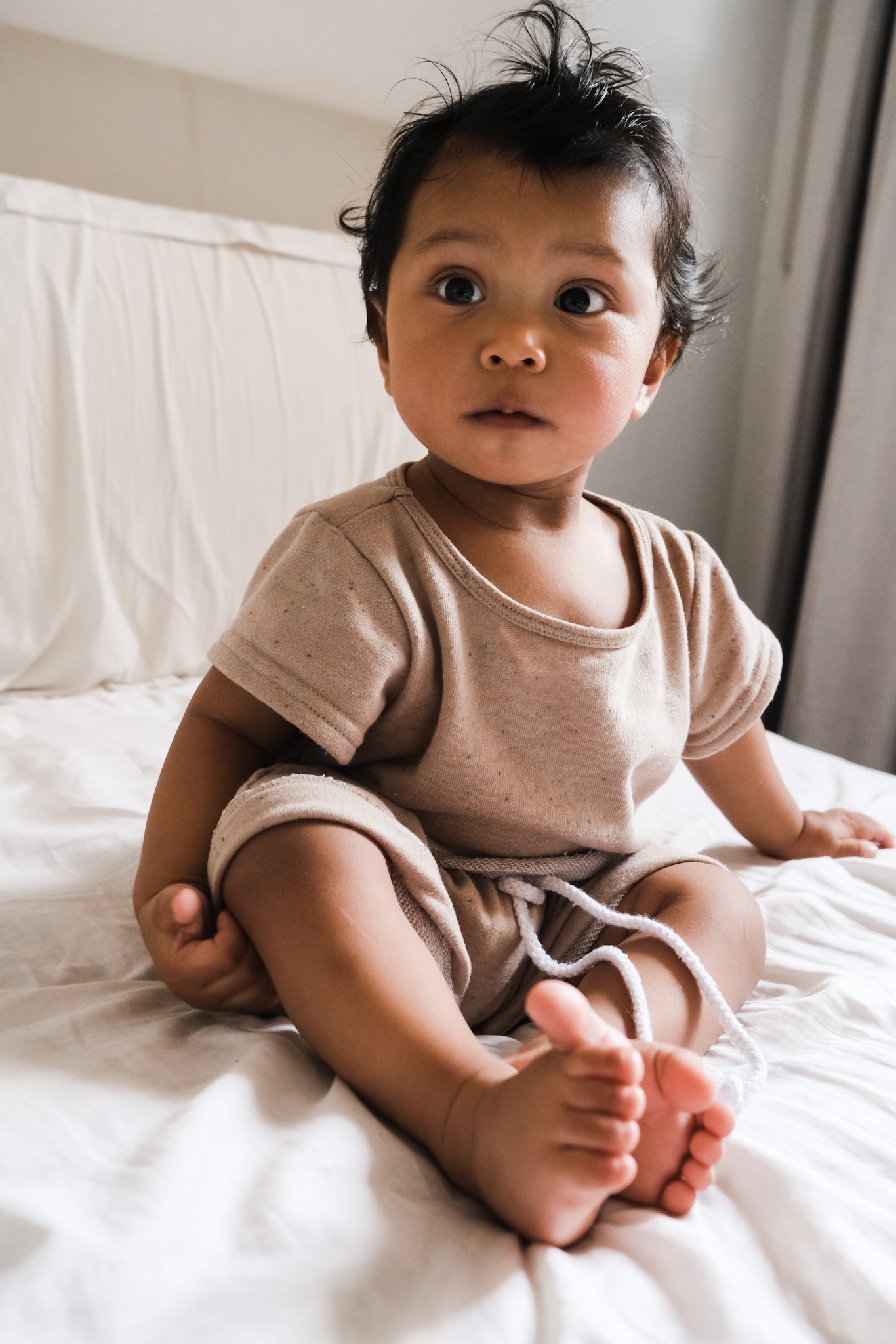 Our Newtown Speckle Set is sure to make an impression. It's wide O-neck and loose fit gives little bub their own unique urban style. A great addition to your little ones summer wardrobe.