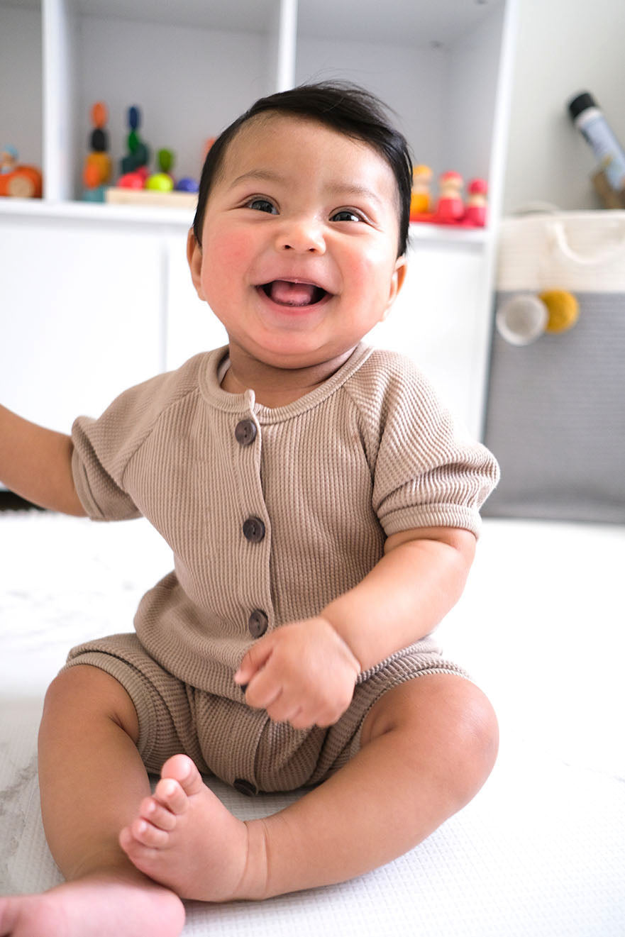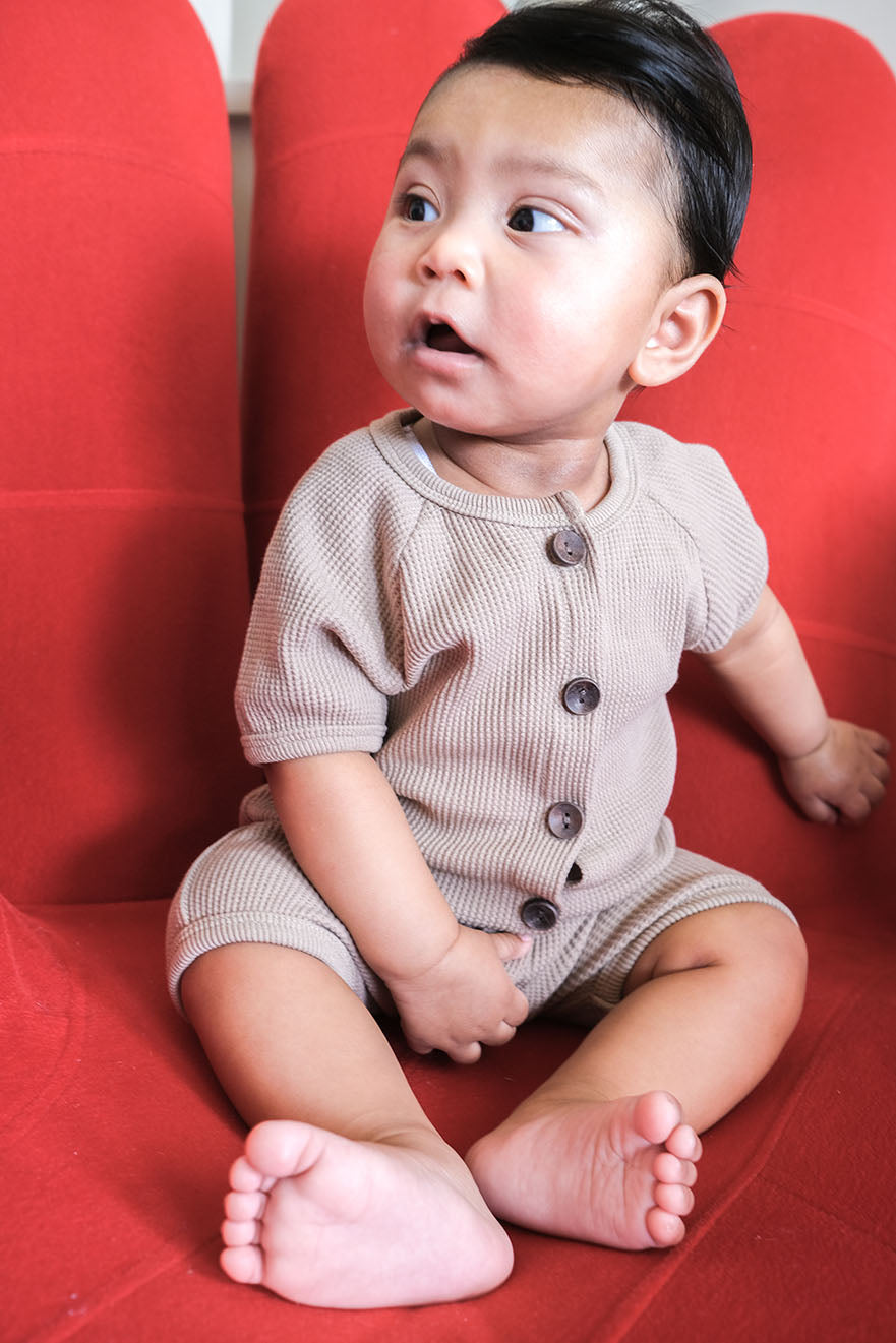 Our Romshaker Baby Romper features button down front, short sleeves and are a comfortable knee length. Made from waffle cotton and spandex fabric, it is lightweight and stretchy making it ideal for summer styling without restricting your little one from play.